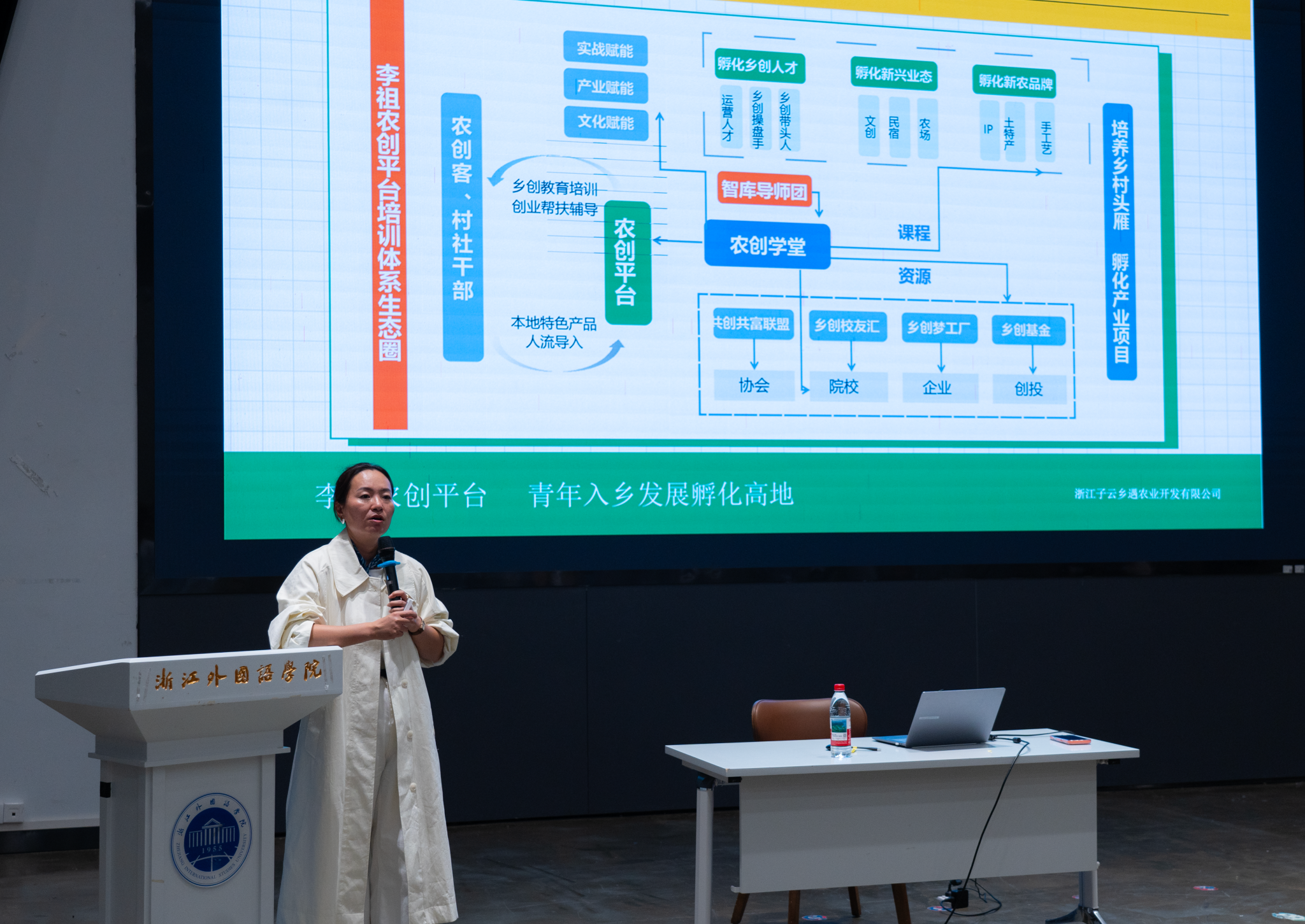 讲座中,金靖老师回顾自身从城市文创园转向乡村创业的历程,讲述李祖村从“三无村”蝶变为网红乡村、首批“小红村”的实践故事。她介绍,李祖村依托“千万工程”政策红利,以“低成本创业、高品质生活”为理念,吸引280余名青年扎根,培育80余种特色业态,形成文创、咖啡、手作、研学等多元产业生态。